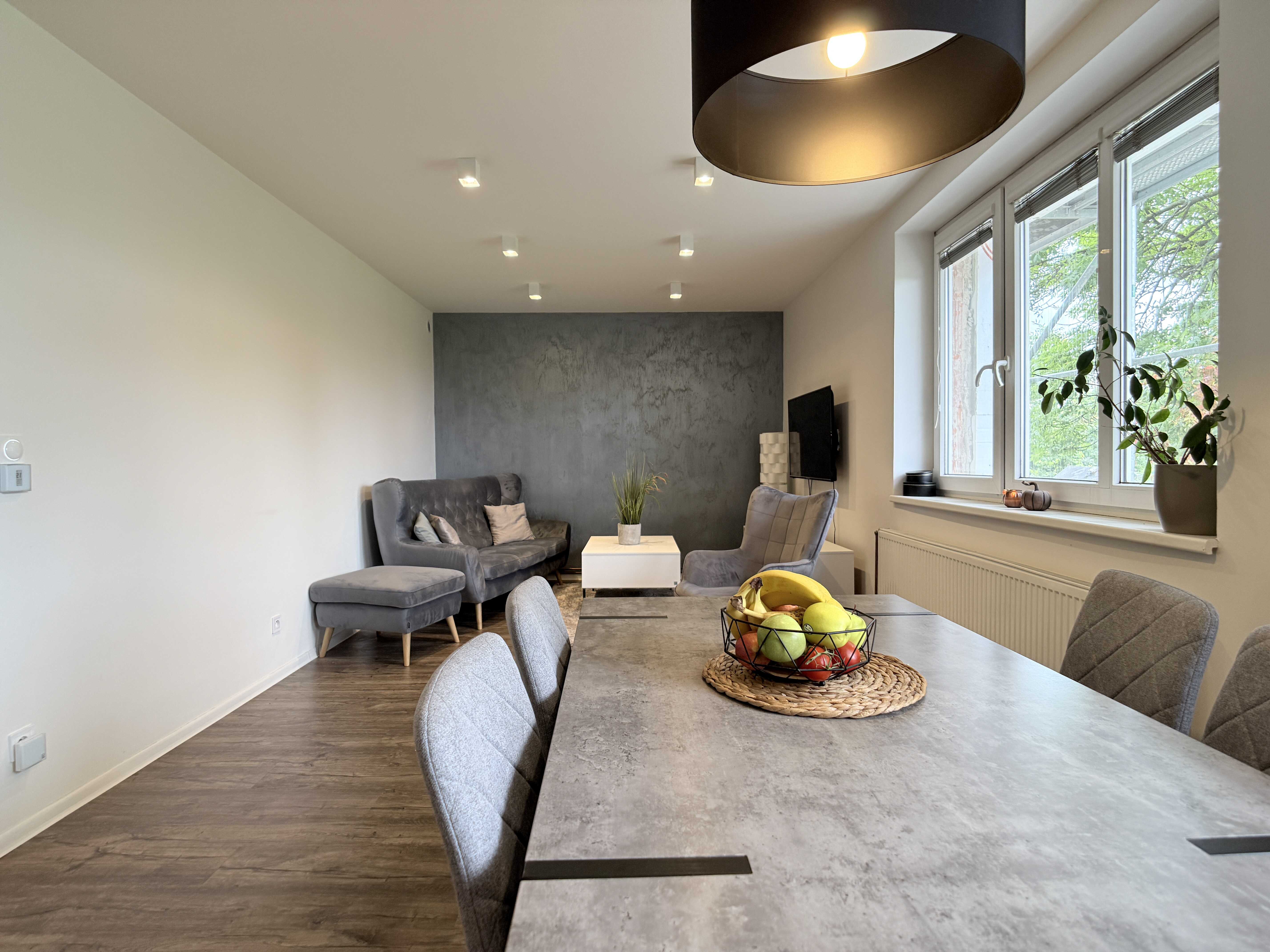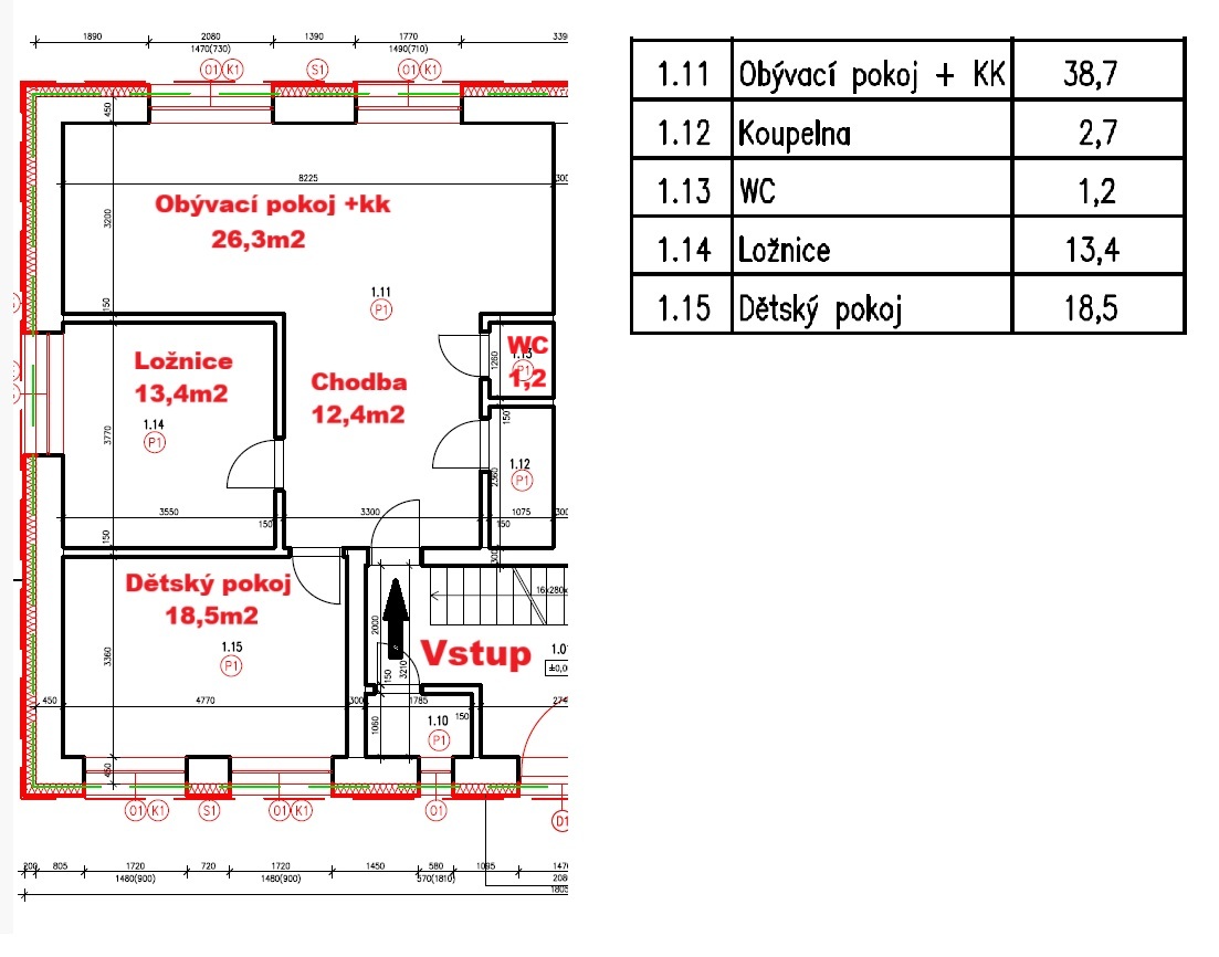 Dominantou je prostorný obývací pokoj s kuchyňským koutem, který tvoří přirozené centrum domova.
