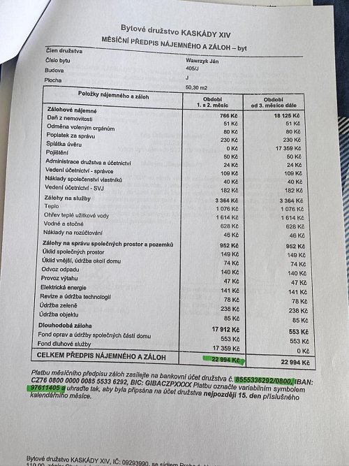 5 782 Kč – měsíční provozní poplatky (fond oprav, správa, služby)