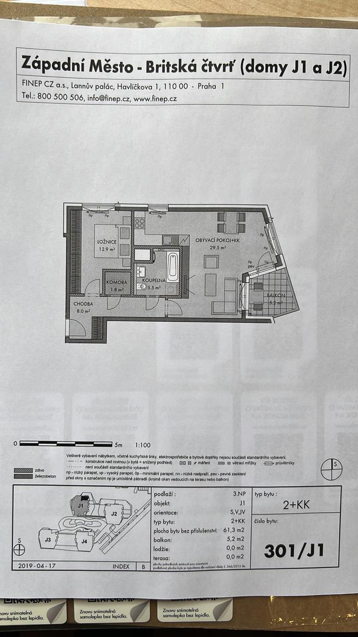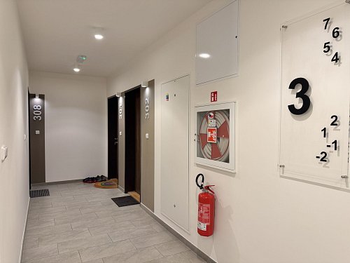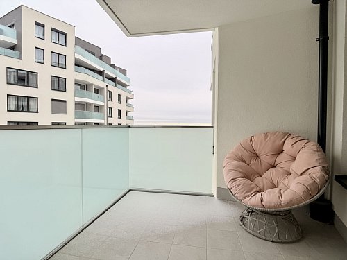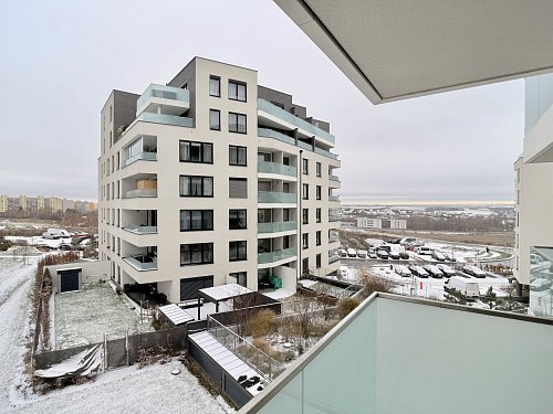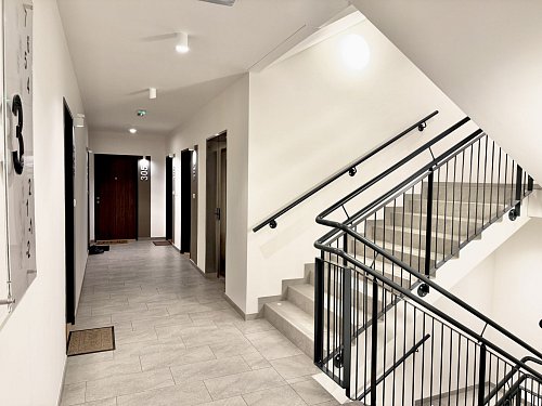 Nadstandardně vybavený byt 2+kk o velikosti 61 m² s lodžií 5,2 m², umístěný v 3. patře moderní novostavby od Finepu s výtahem, garáží, kočárkárnou a kolárnou.