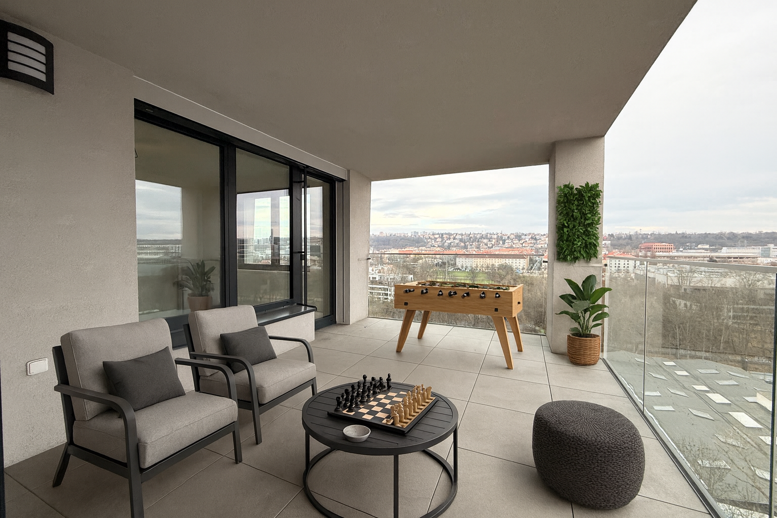 Hlavní terasa nabízí dostatek prostoru pro rodinné posezení, saunu, vířivku v samotném soukromém rohu terasy. Je ideální pro letní grilování, sportovní aktivity dětí či vytvoření vlastní zahradní oázy.