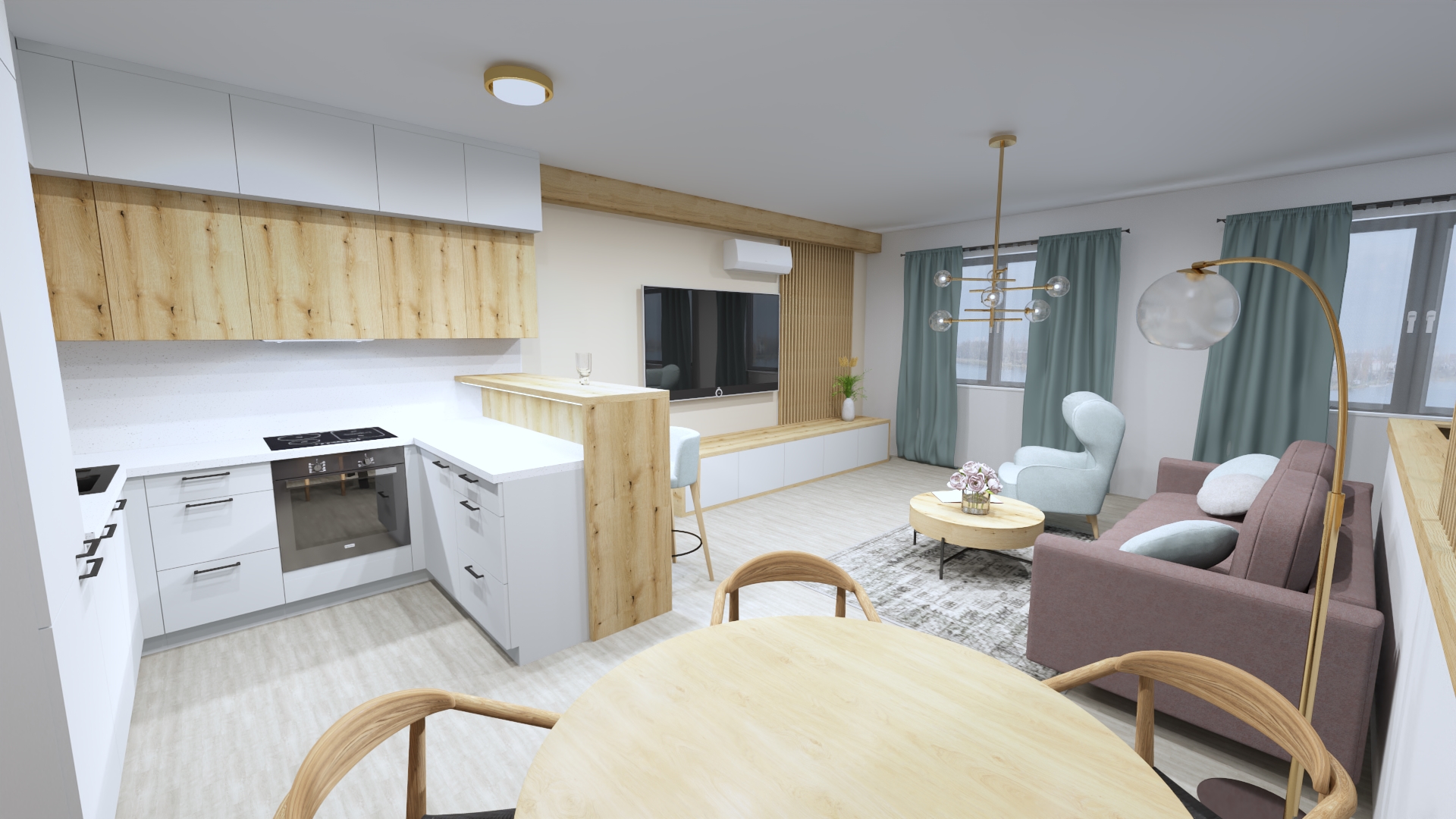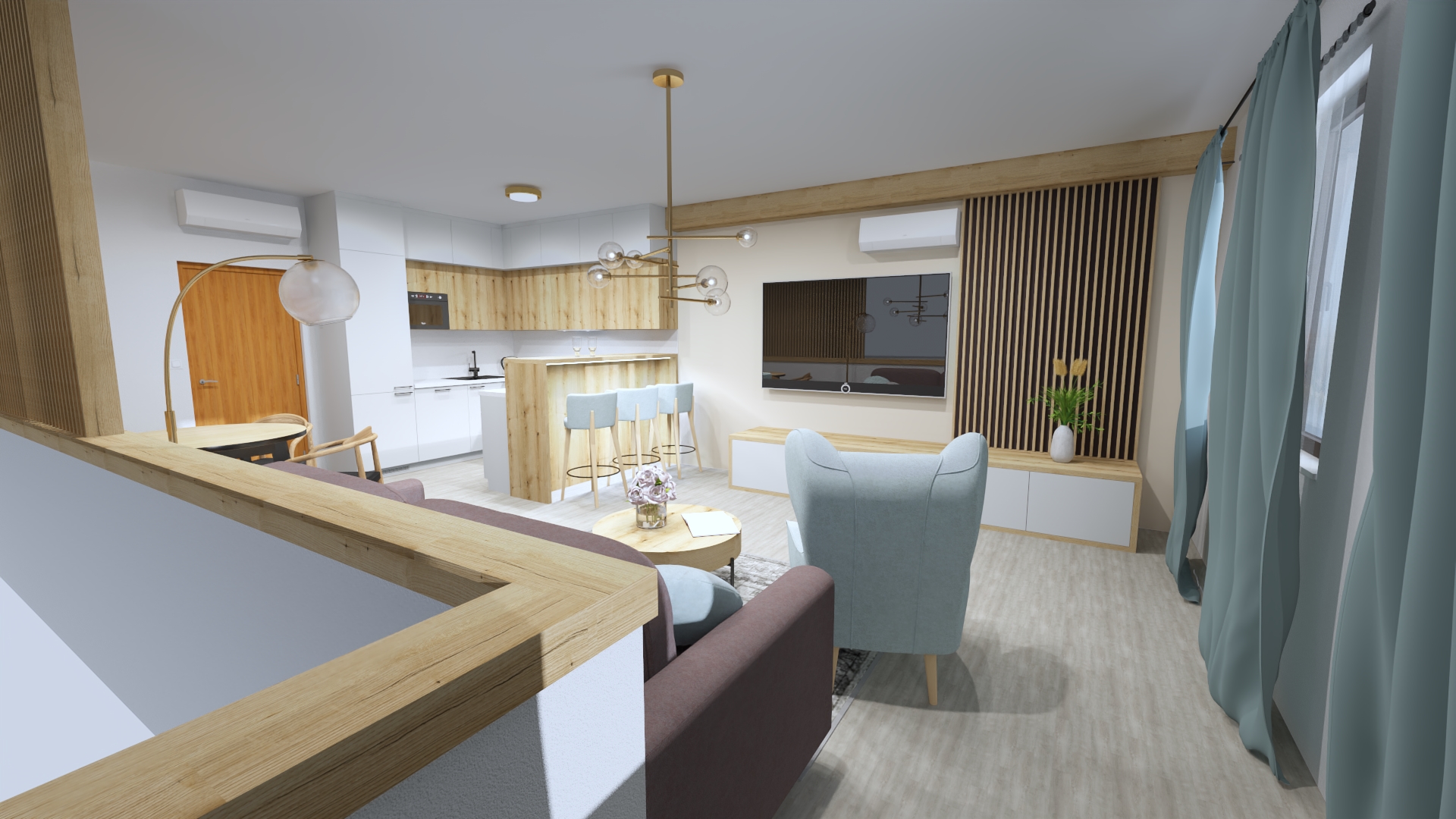 obývací pokoj s přípravou na kuchyňskou linkou do tvaru