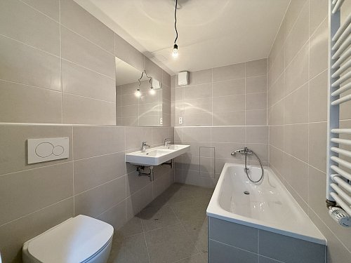 druhá koupelna s vanou a dvěma umyvadly