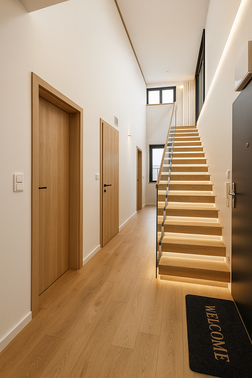 Byt je rozdělen do dvou podlaží, oddělující soukromou zónu od společenské části.