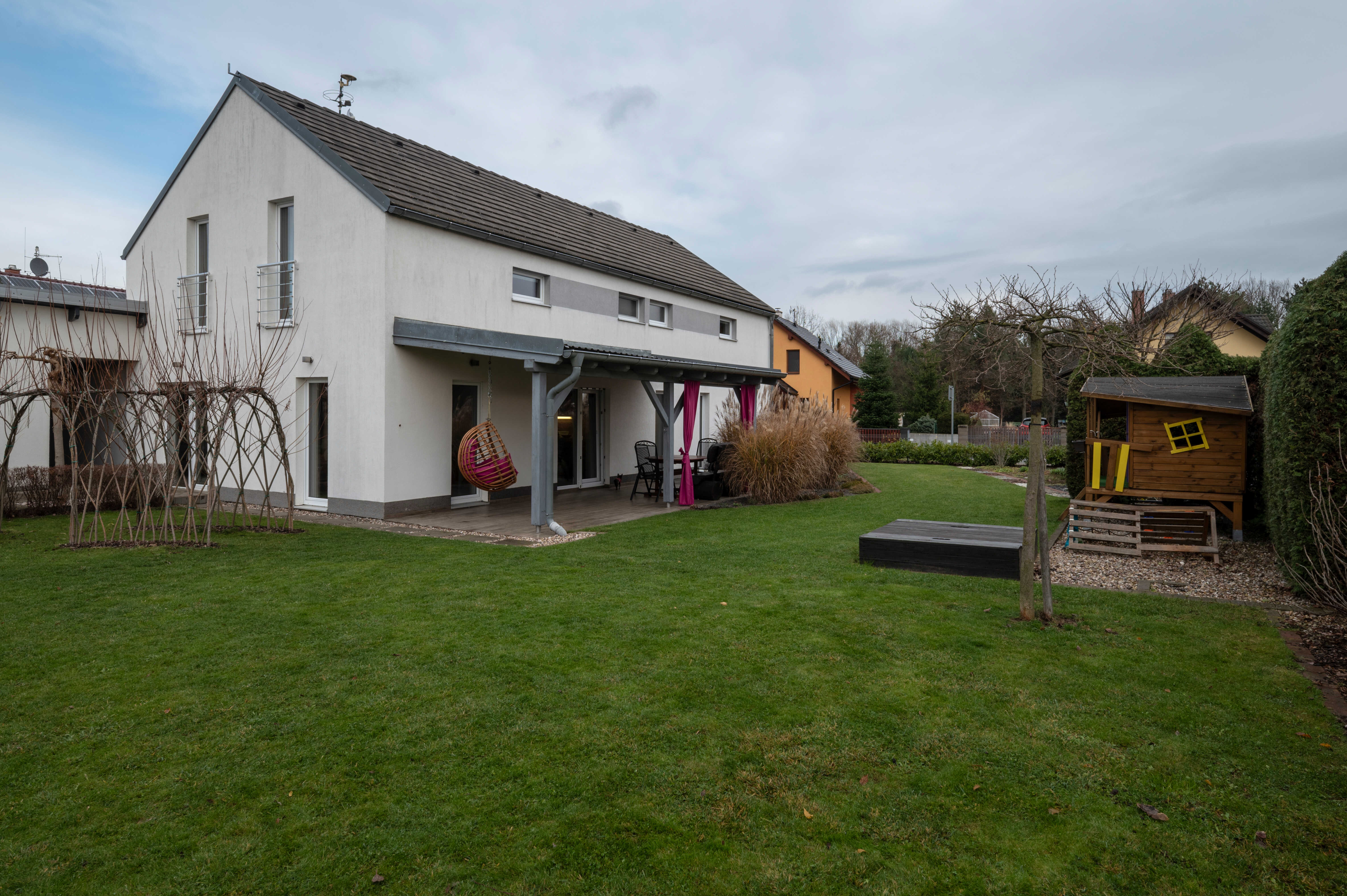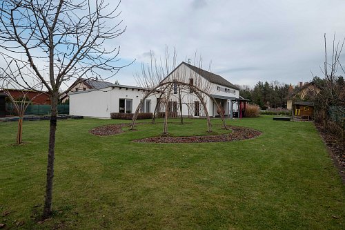Zahrada je oplocena, ze tří stran odstíněna vzrostlými dřevinami – maximum soukromí a pohody.