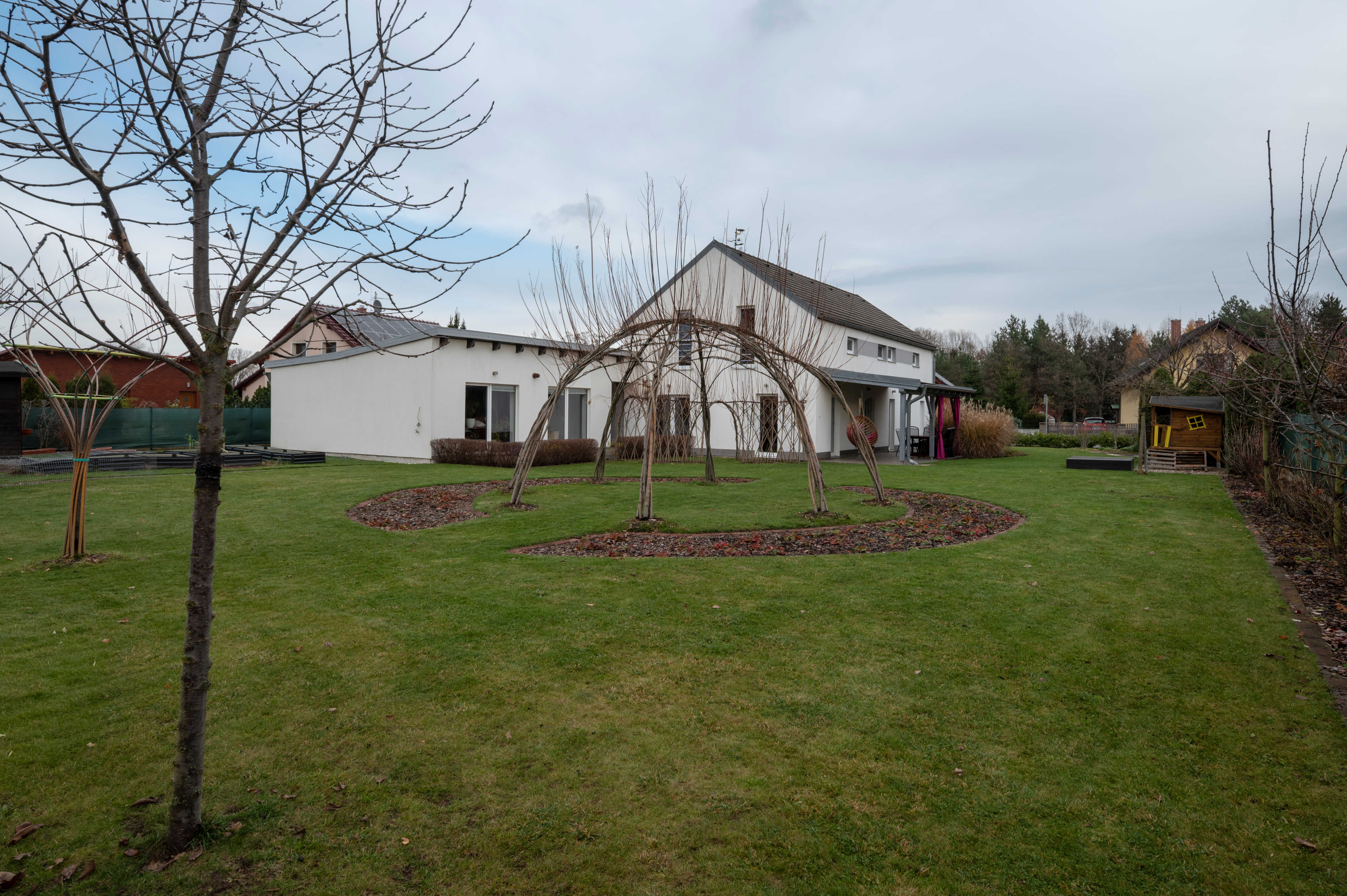 Architektonicky navržená zahrada není jen o trávníku – je to místo pro společné chvíle, sklizeň ovoce, zahradničení, hry, učení i odpočinek. Děti tu mají vlastní svět, dospělí zase prostor k relaxaci.