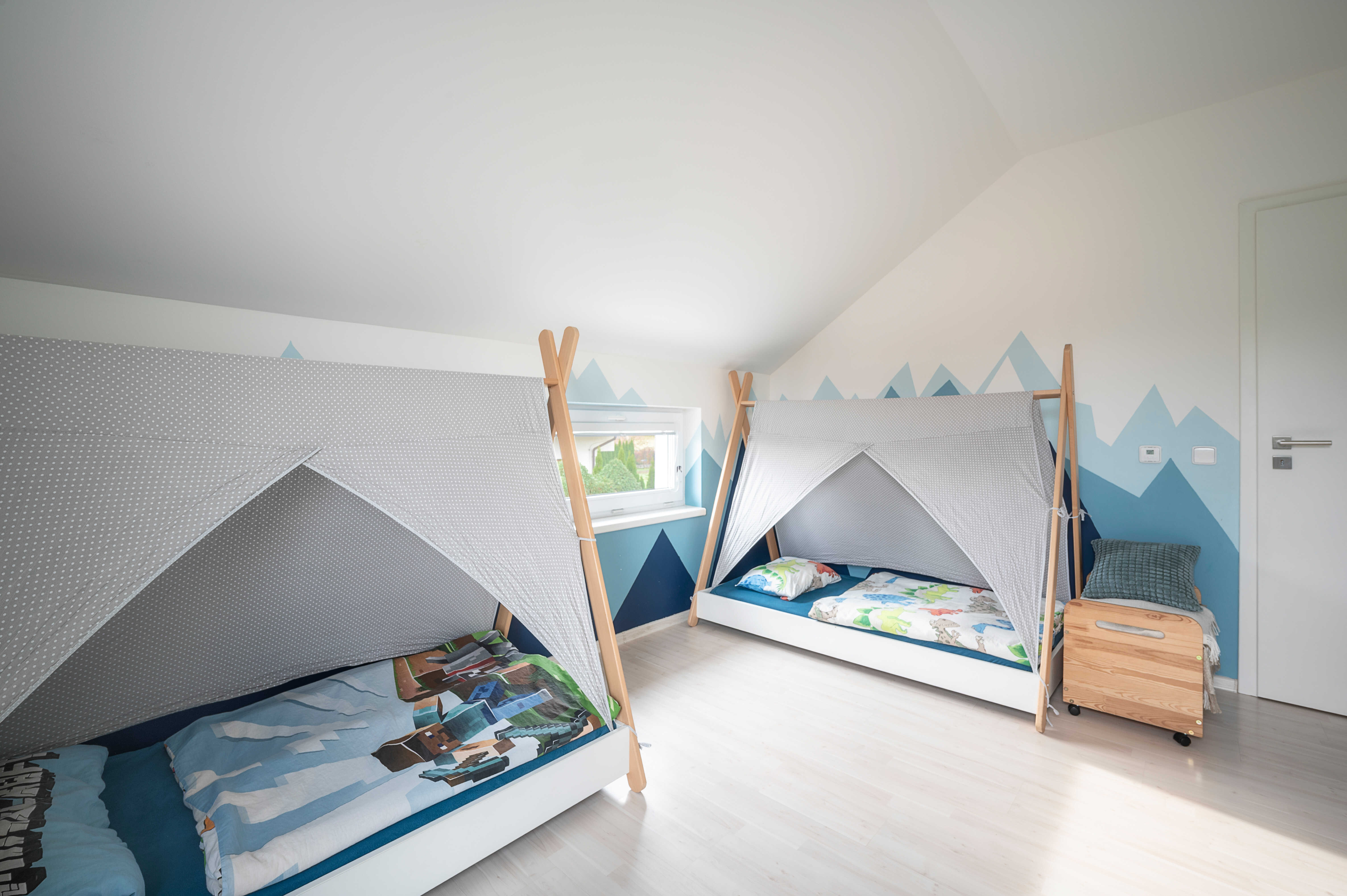 V patře vás překvapí čtyři světlé ložnice a prostorná koupelna. Dispozice je promyšlená tak, aby každý člen domácnosti měl své místo a zároveň zde zůstával dostatek společného prostoru.