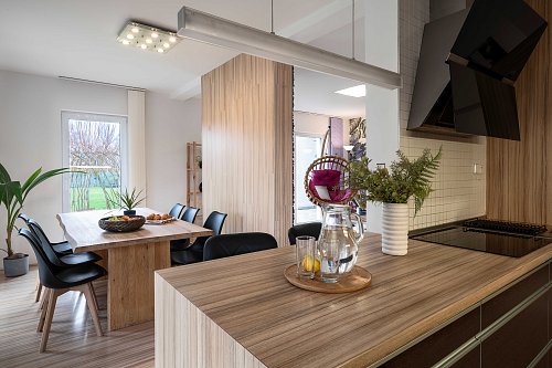 Hlavní obytná část o propojené dispozici obývací pokoj – kuchyně – jídelna vytváří srdce domova, odkud pouhým otevřením francouzských dveří vstoupíte na krytou terasu a do zahrady.