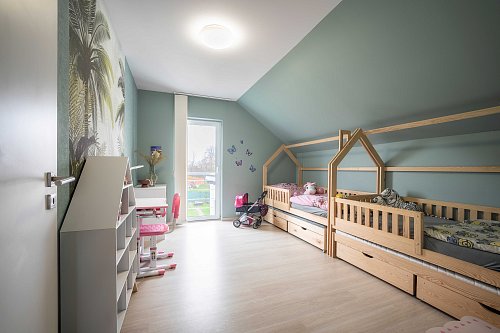 Dispozice 6+kk nabízí přesně to, co rodiny hledají: velké společné centrum domova, čtyři ložnice pro děti či hosty, soukromou rodičovskou část v přízemí a navíc velkou pracovnu. Každý má své zázemí, ale rodina je stále pohromadě.
