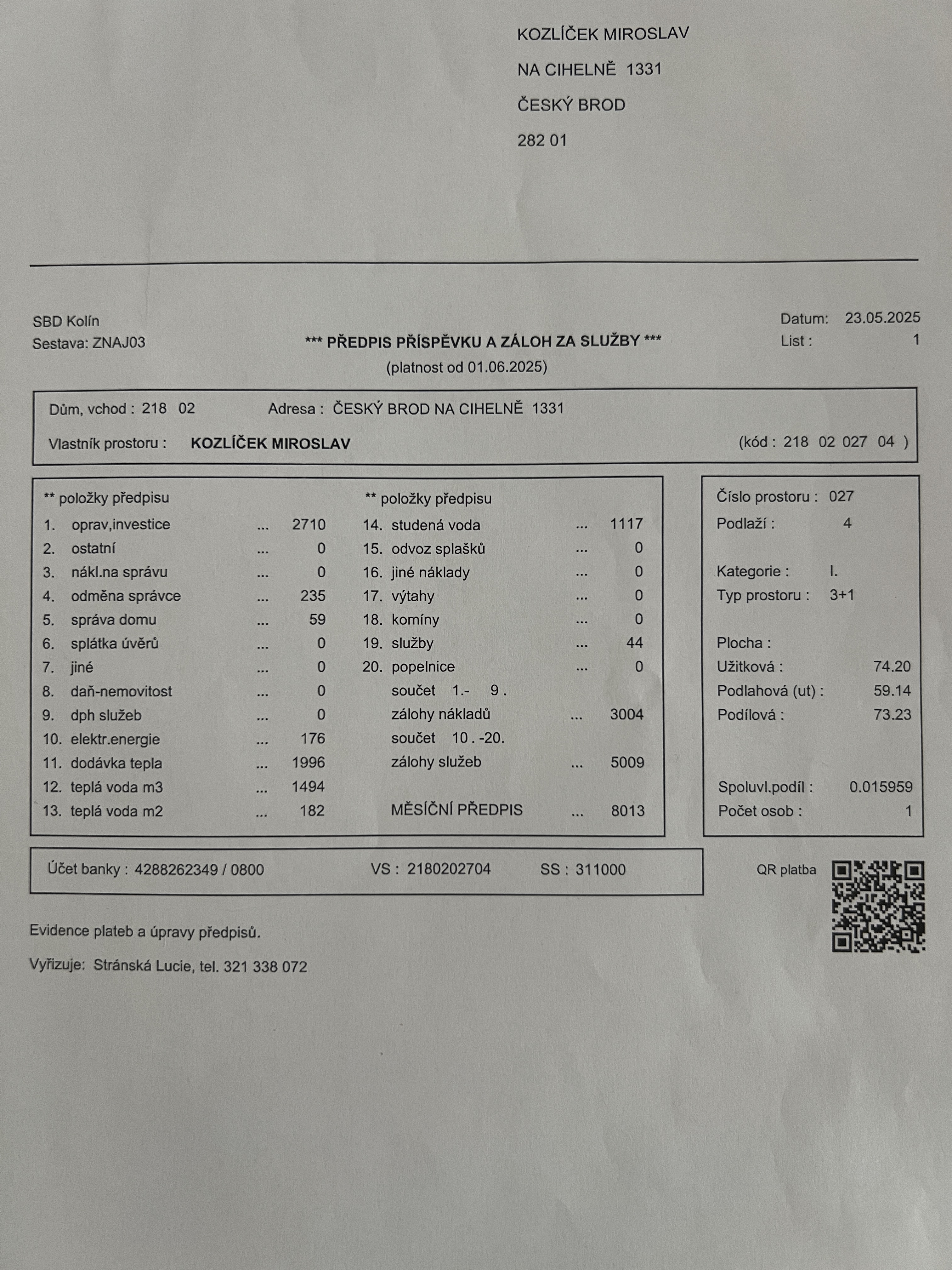 Náklady 5 303,-Kč + el. 1,000,-Kč + plyn 500,-Kč