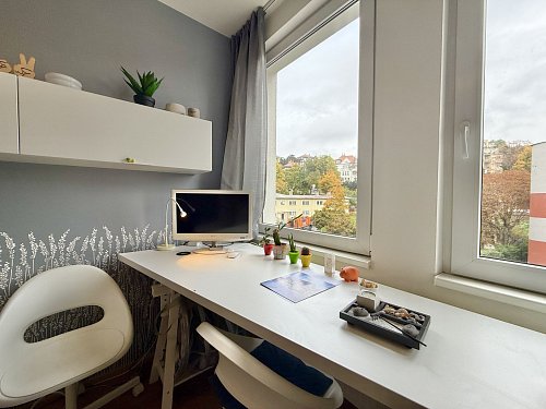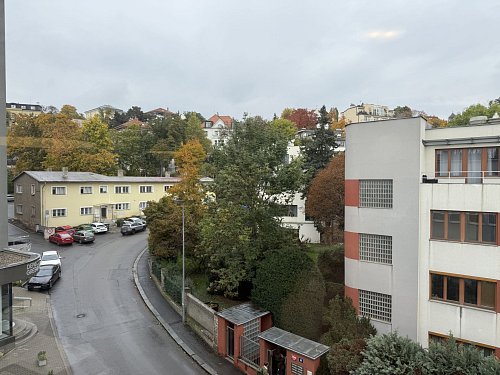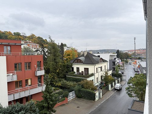 Klid a výhled: Okna bytu směřují do ulice Perucká s výhledem do vilové zástavby. I přesto, že za domem projíždí vlak, jeho provoz vás nebude rušit – maximálně při posezení na terase.