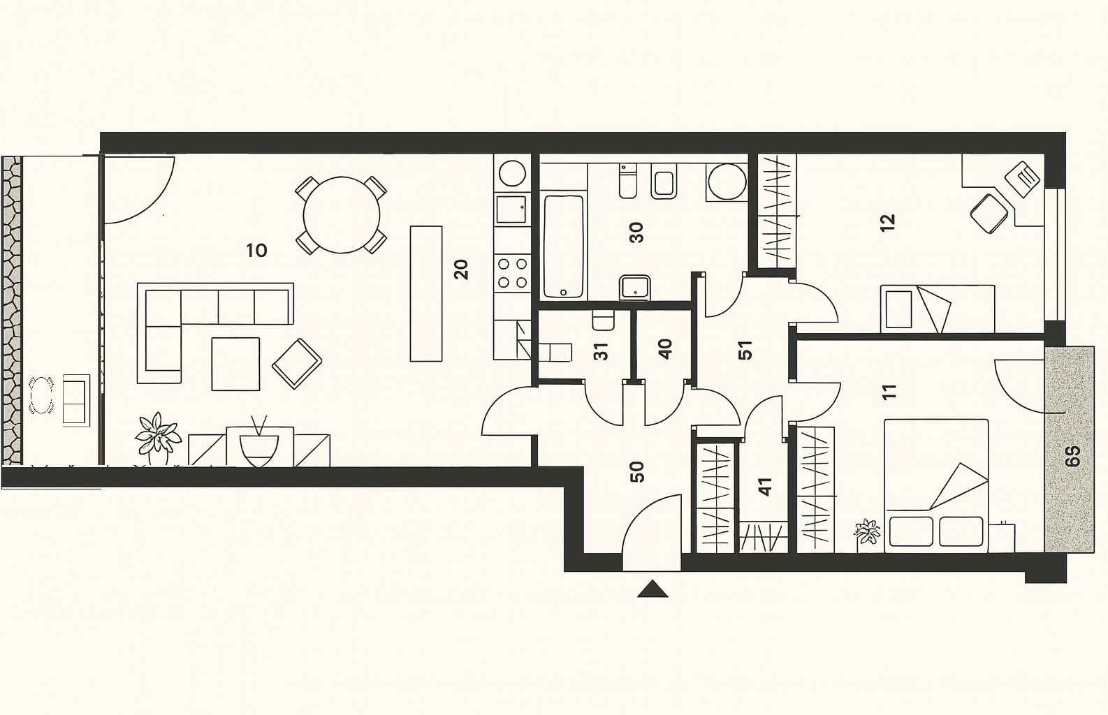 Klidová část (2 pokoje + koupelna + komora) je oddělená předsíní.
