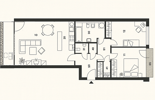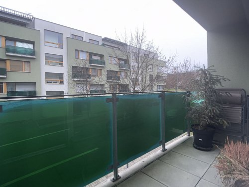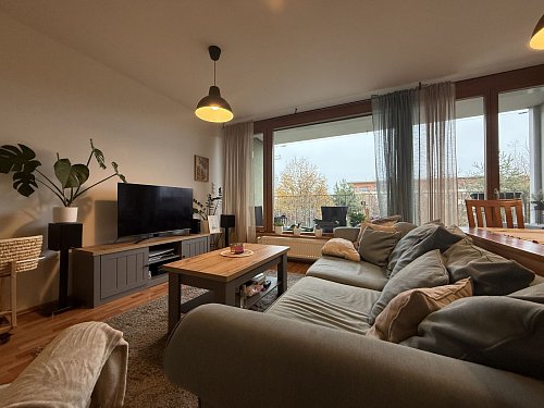 Dominantou bytu je velkorysý prosklený obývací pokoj s krásným výhledem do zeleně. Díky celoplošnému prosklení působí vzdušně, otevřeně a poskytuje pocit propojení s přírodou.