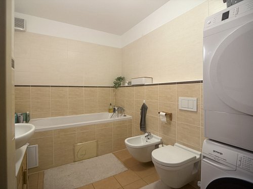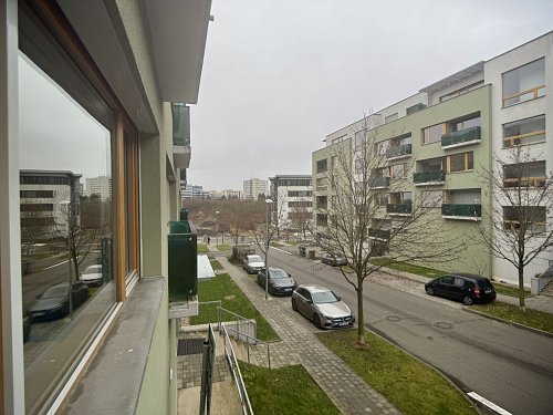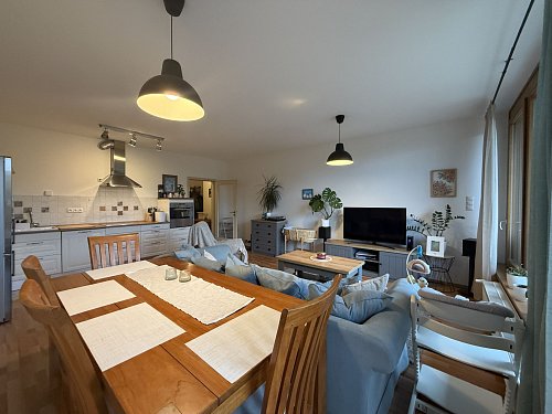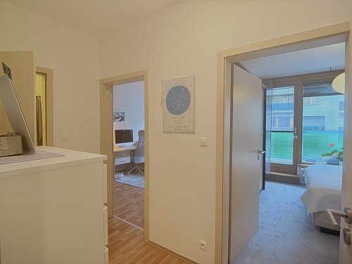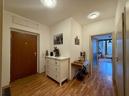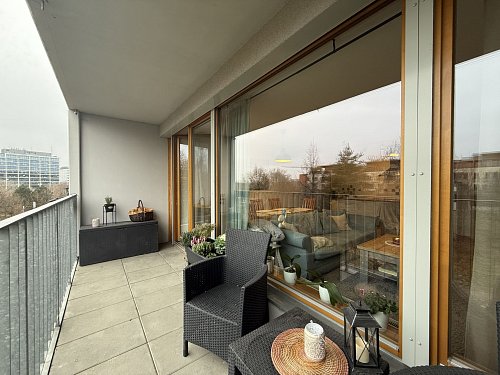 Byt o velikosti 3+kk (98 m²) včentě balkonu 4m2 a terasy 8m2 se nachází v 1. patře novostavby s výtahem a je prakticky rozdělen na dvě zóny: