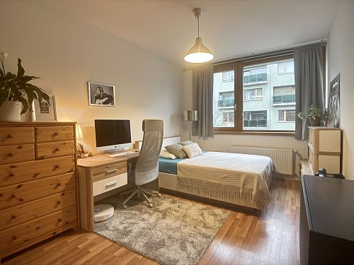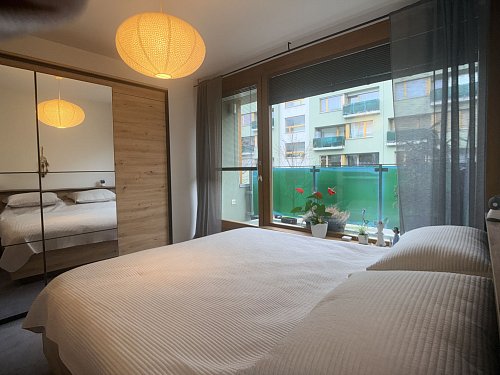 V celém bytě jsou plovoucí podlahy a velká okna, díky nimž je byt příjemně světlý po celý den.